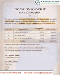 It is prepared and certified by a Chartered Accountant (CA), who verifies the applicant’s total assets and liabilities. Since it serves as an official declaration of financial worth, it is widely requested for visa applications to countries such as the USA, Canada, the UK, and Australia.