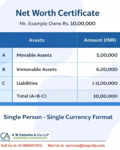 A Net Worth Certificate is an official financial statement issued by a Chartered Accountant (CA) that summarizes an individual’s or business’s total assets minus liabilities. It represents your true financial standing on a given date.